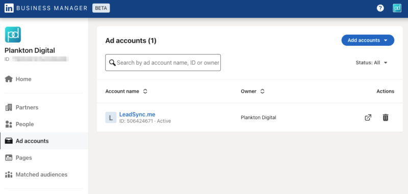 Now that you’ve added your own page and a client’s page, let’s add LinkedIn ad accounts.
