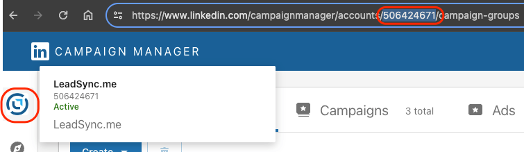 To find your LinkedIn ad account ID go to the standard LinkedIn Ads manager and mouse over your business icon, or just copy the ID from the URL.
