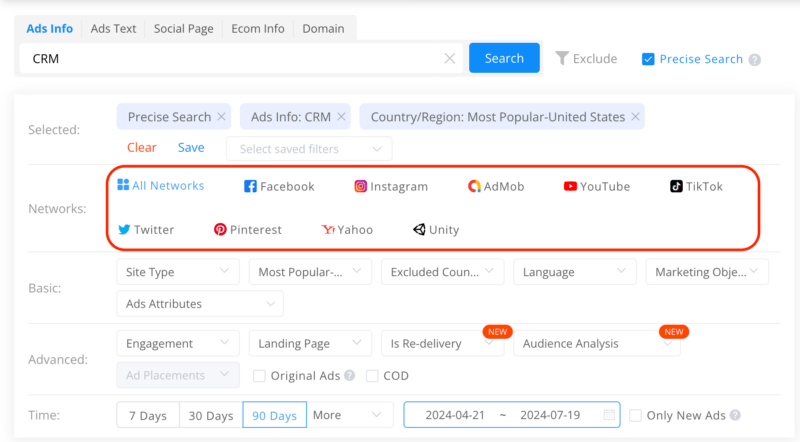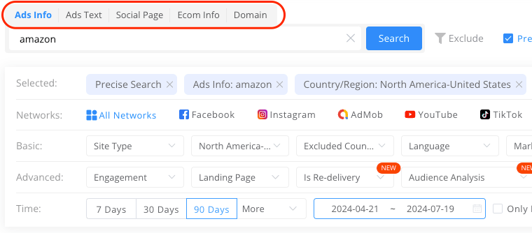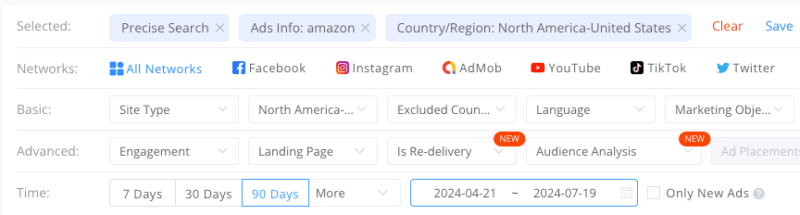 BigSpy’s search filters and ad search options provide incredibly detailed control, enabling users to fine-tune their searches based on criteria such as: