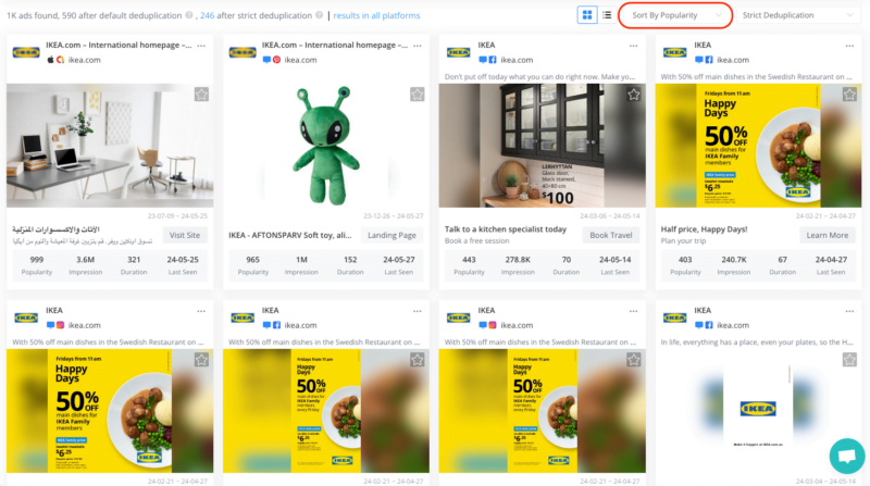One of my favourite features is the Sort by Popularity feature which allows you to sort by the most popular ads virst. Here’s an example of ads being run by Ikea in Australia.