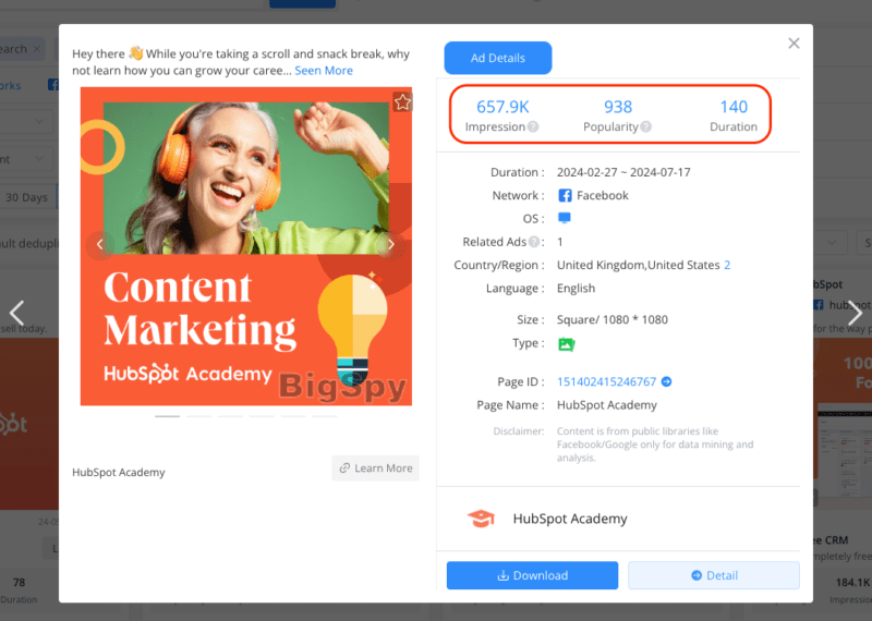 Among BigSpy’s most invaluable features are its detailed ad insights. Users can access metrics such as: