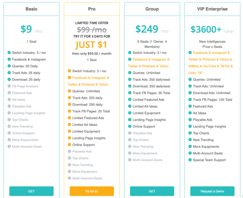 BigSpy offers affordable pricing plans that cater to different user needs and budgets. Here are the available plans: