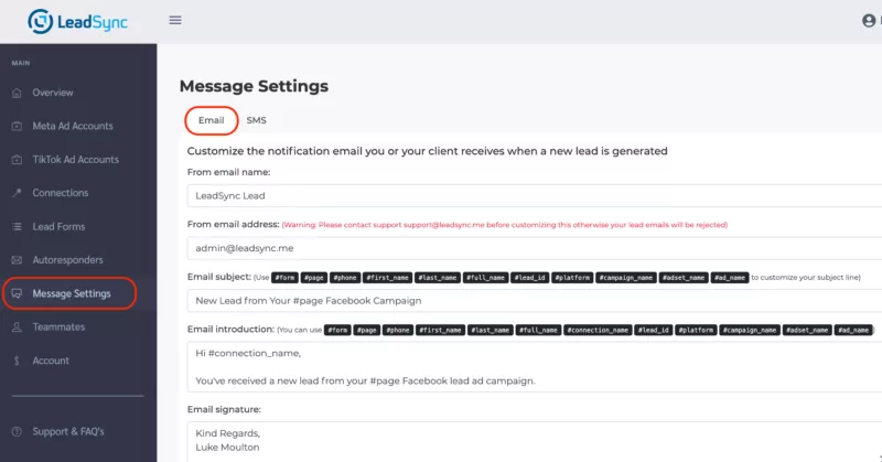 - Log in to LeadSync: Access your dashboard and navigate to the Message Setting section.