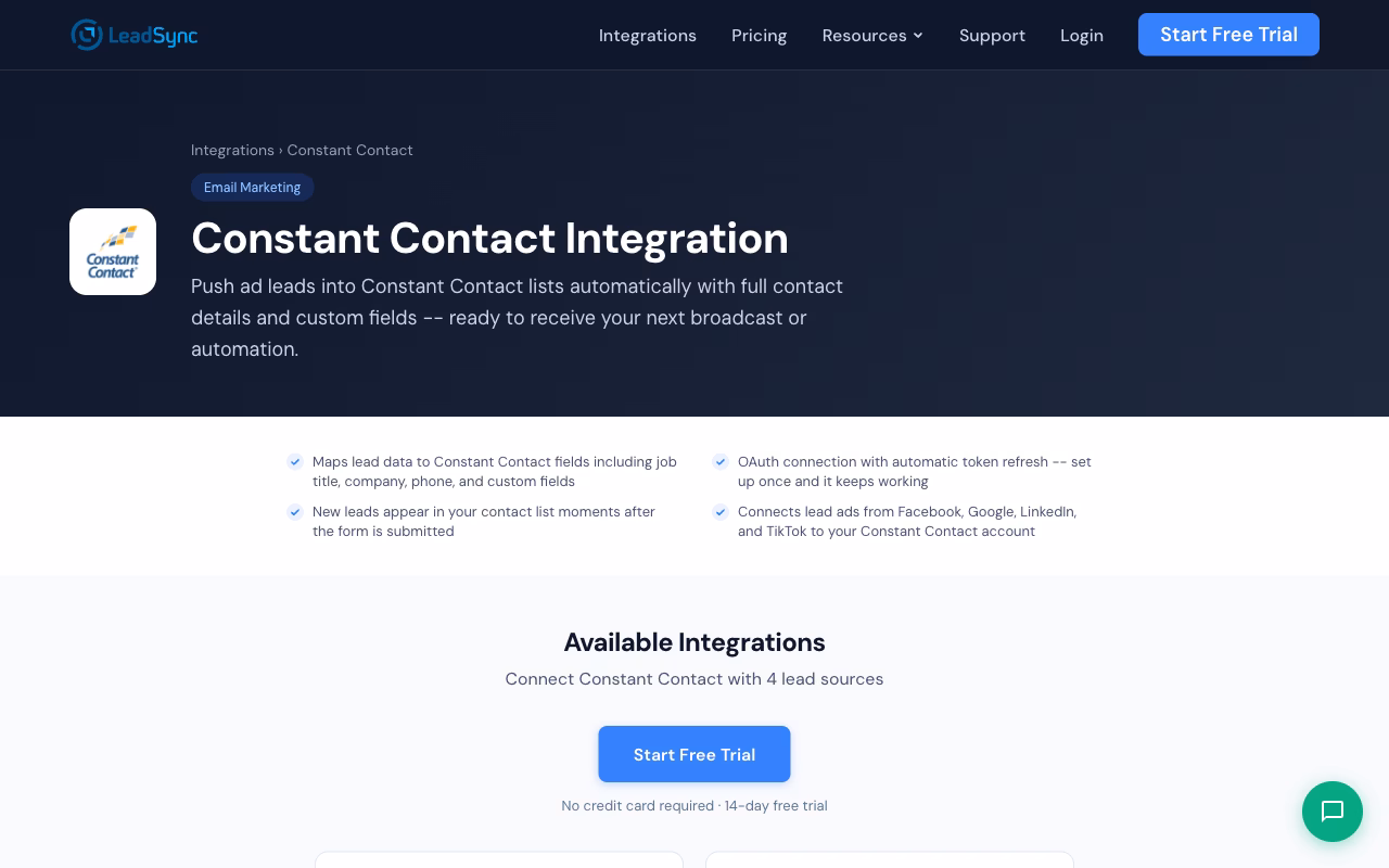Try LeadSync free for 14 days. Connect Facebook to Constant Contact, watch your first leads arrive, and start your email follow-up immediately. No credit card required.