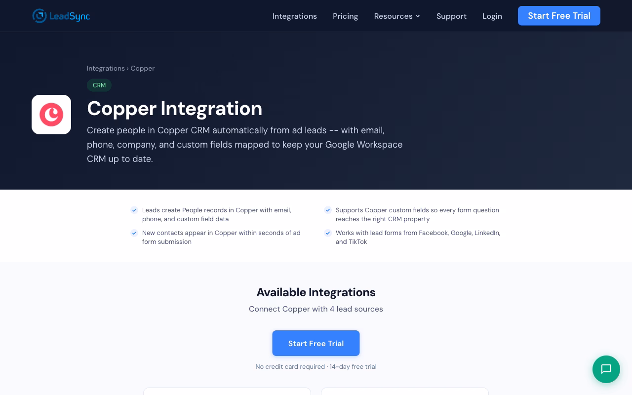 You need a Business or Agency account in LeadSync. Copper integration is not available on the free tier. Start a free 14-day trial of any paid plan to test with your real campaigns.
