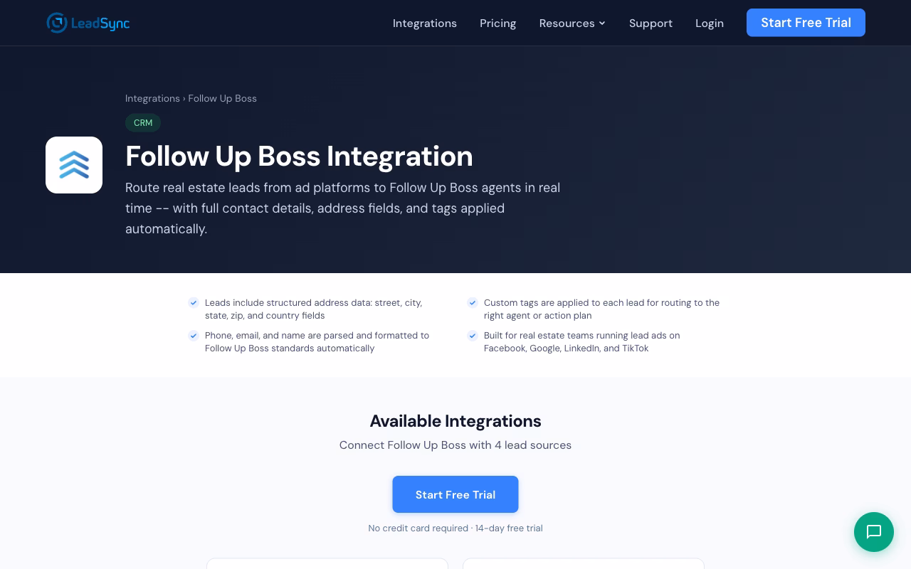 Yes. Follow Up Boss requires a paid LeadSync account (Business or Agency tier). Free accounts don’t support Follow Up Boss integration. Start your free 14-day trial of any paid plan to test.