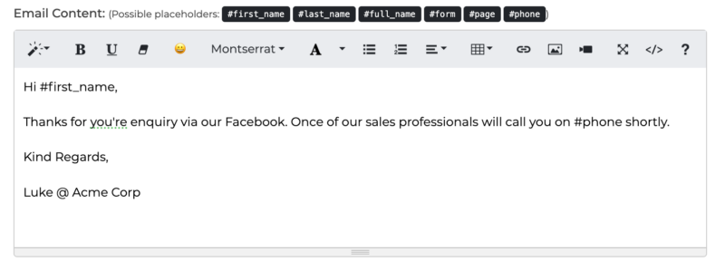 Note: you can use tokens such as #fist_name, #last_name, #full_name, #form, #page and #phone details from your lead form to insert content dynamically.