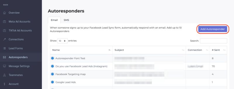 - Go into the Autoresponder section, and add an autoresponder for each connection that connects to a different Lead form.