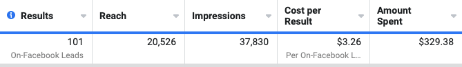 Your Cost Per Lead metric is visible from within Facebook Ads Manager and looks something like this:
