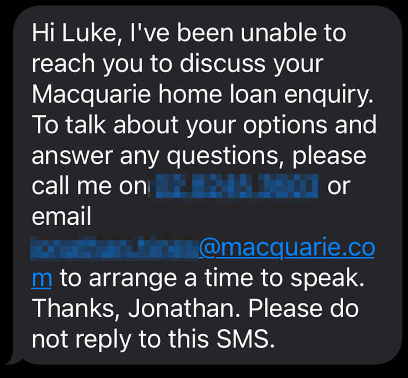 Within 30 minutes of submitting this form I had a missed call from Macquarie Bank. After they were unable to reach me, they sent me an SMS: