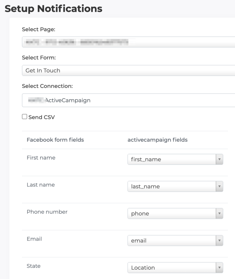 Select your Page and the Form being used in the lead ad. Then select the ActiveCampaign connection you just created.