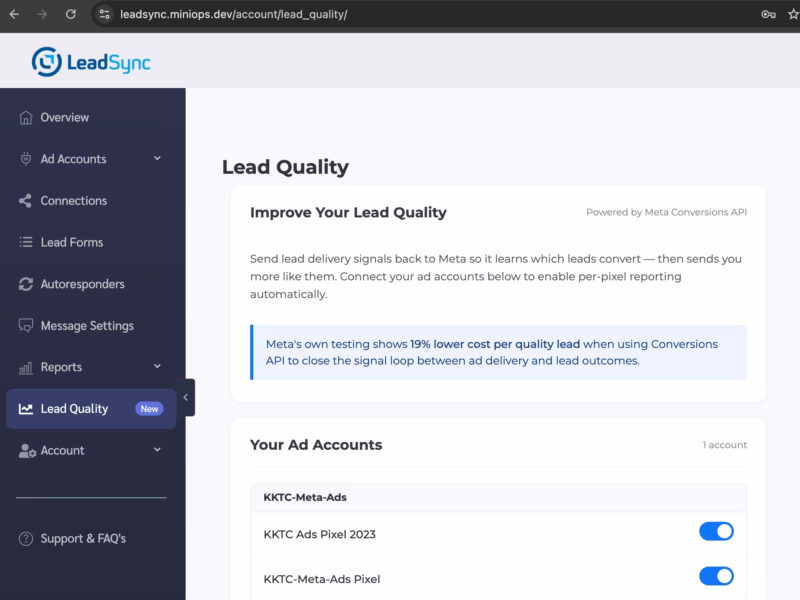 If you’re connected via Meta Business Manager (which most agencies and businesses are), LeadSync automatically discovers your ad accounts and pixels. Just toggle the ones you want to enable — no copying and pasting Pixel IDs or access tokens.