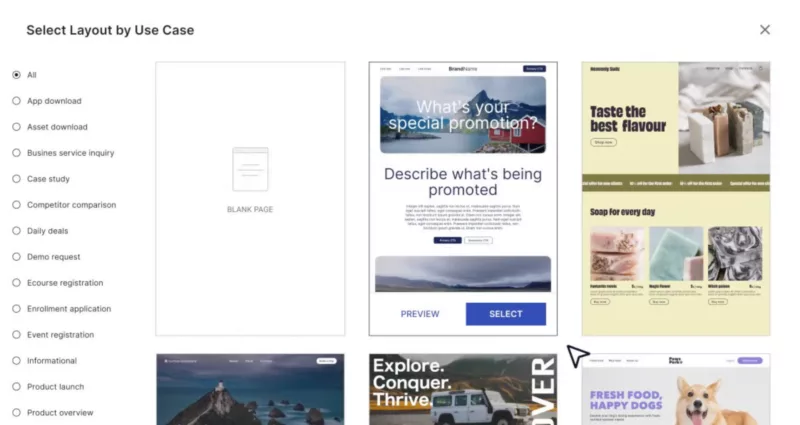 While Instapage offers a range of pre-designed templates, it also provides advanced customization options for those who want to create unique landing pages. Users can choose to start from a ‘blank page’ if they want to build a design without any pre-existing elements. Users can adjust every element on the page, from fonts and colors to layout and spacing, ensuring that the landing page aligns perfectly with their brand identity. You can even get AI to help you write headlines, paragraphs, and CTAs for A/B tests.