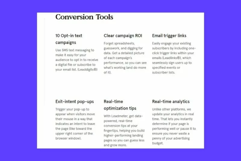 Leadpages doesn’t merely offer a basic landing page creation service; it’s an all-encompassing marketing toolkit. Here are some of its key features and capabilities: