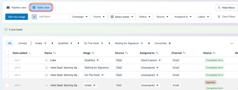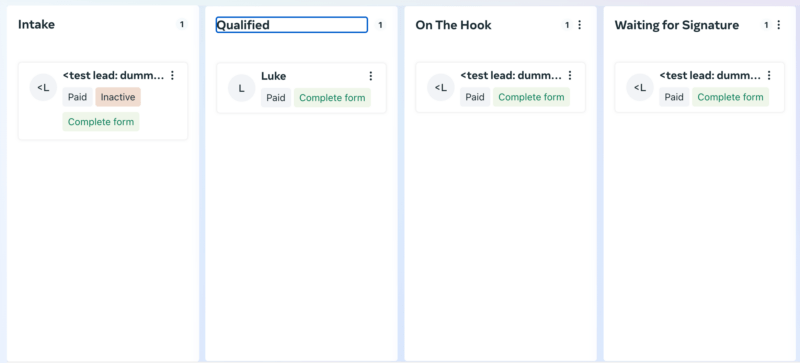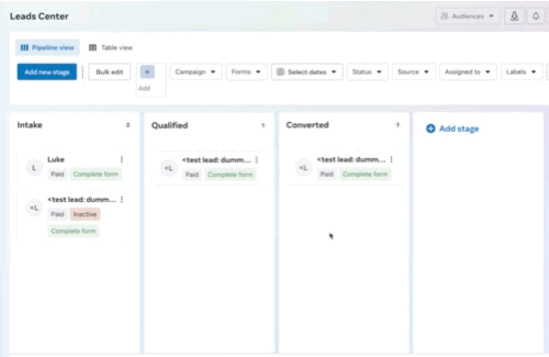 The default Leads Center view includes 3 columns in a Kanban type board called the Pipeline view.