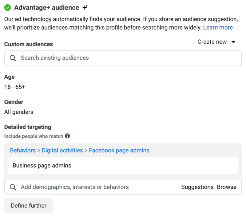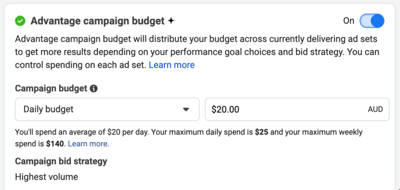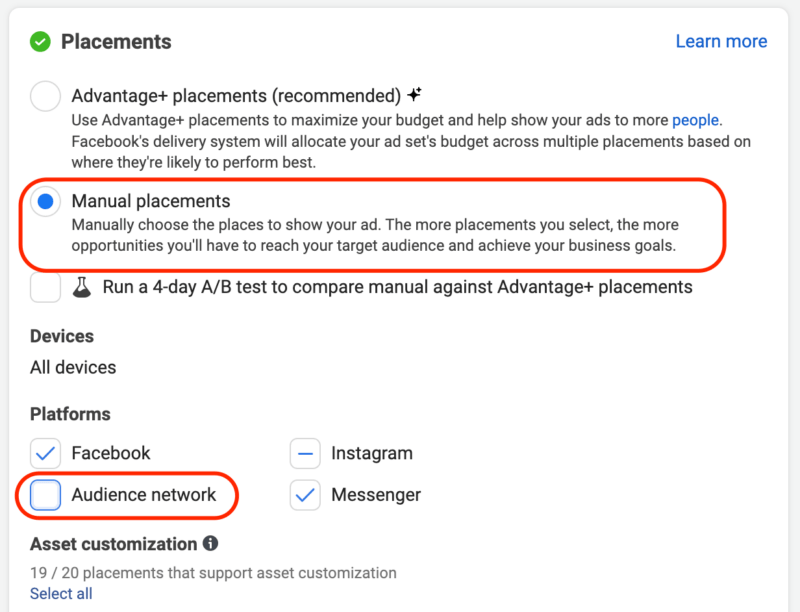 By default, this is set to Advantage+ placements. Personally I’ve found that this can generate a lot of low quality click from the Audience network, so my preference is to change this to Manual placements and un-check the Audience network option.