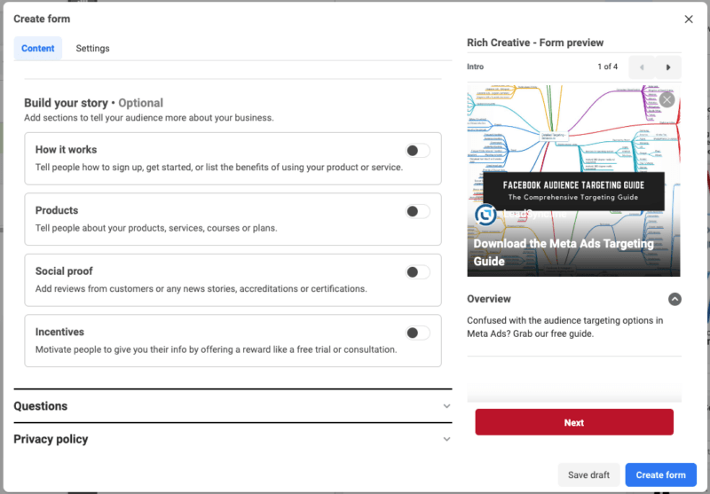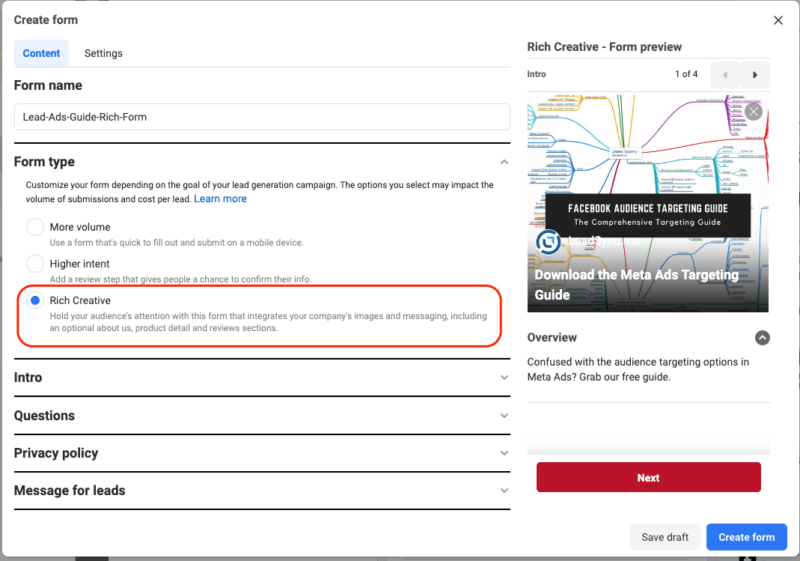The “Rich Creative Form Type” setting in Facebook Lead Ads allows advertisers to include more dynamic and engaging content in their lead generation forms. You’re likely familiar with the standard lead forms on Facebook, which are pretty straightforward with text fields and maybe an image.