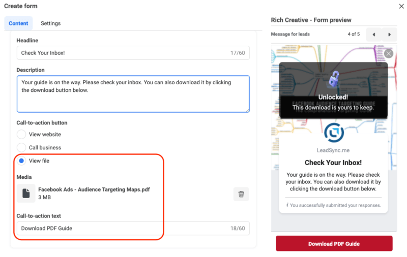 In this example, I’ve used our Facebook Audience Targeting guide as a lead magnet. You can give people the opportunity to download a PDF, PNG or JPEG (up to 10MB) once they’ve shared their details. Given most people are on mobile devices, I suggest you also email them the document. You can do this using our lead form autoresponder feature.