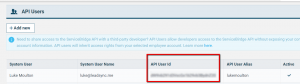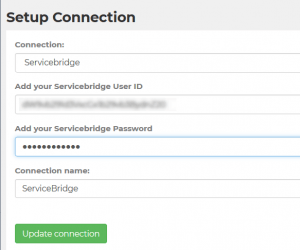 - Click on Connection drop-down arrow and select ServiceBridge, copy/paste your saved API User ID in the corresponding box, put your ServiceBridge account password in text box and name your Connection ServiceBridge. Hit Update Connection