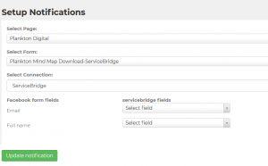 - Select the correct Facebook business page and lead form (should be the same lead form you used in your lead campaign). Select ServiceBridge as a connection. If you use custom fields in Facebook lead forms and ServiceBridge, make sure to match your Facebook fields and ServiceBridge fields. Otherwise leave the ServiceBridge fields as is because Email, Name, and Source are mapped automatically.