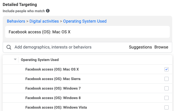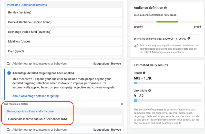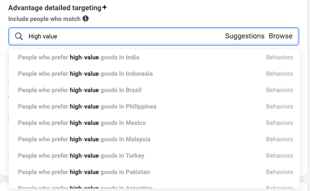 I’m not even going to try to guess why these countries made the cut, however, this is a targeting option worth testing if your audience is in one of these lucky countries. By targeting people who prefer high-value goods, businesses can reach a more relevant audience for luxury products.