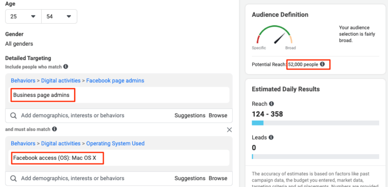 Here’s an example of an audience that targets Facebook Business Page admins who are also Mac OS X users. As you can see, the potential reach is quite small at 52,000 people, but this also means it’s highly targeted.