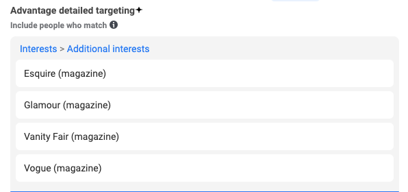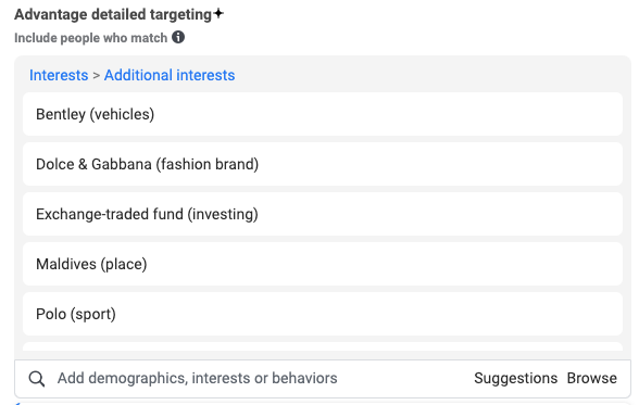 Additionally, targeting interests related to luxury fashion brands can help in reaching affluent individuals who have shown an interest in high-end fashion, exclusive events, and premium lifestyle magazines.
