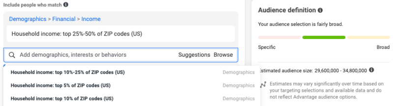 In addition to manually entering ZIP/Postal Code, you can also use the “Household income:” demographic targeting option to target the top 5% to 25% of according to Facebook. Depending on your Facebook Ad account location, you may see other options here.