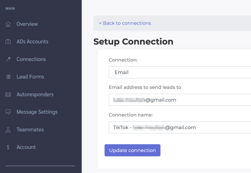 Select Email from the Connection dropdown. Enter the email address you want to send leads to and name your connection (for internal purposes only).