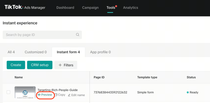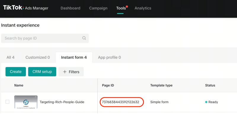 If you need to check the form ID you’re using in your ads, you’ll find it in the Tools > Instant Page section in TikTok Ads Manager.