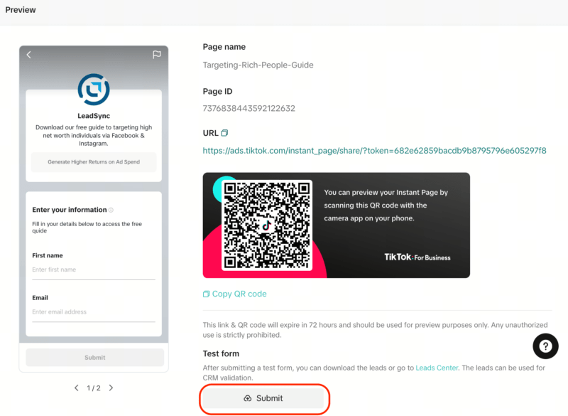 To send a test lead: go to the Tools > Instant Page > Instant Form section in TikTok Ads Manager and click on the Preview link next to the form you want to test.