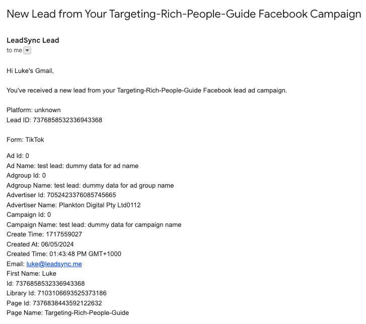 What will my TikTok Lead Email notification include? Your TikTok lead email notification will include all the form data as well as additional advertising data. Here’s an email example: