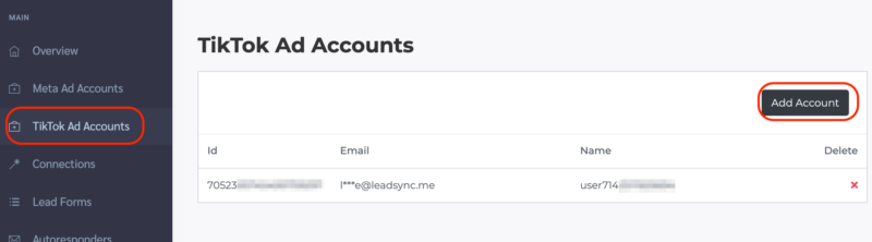 Connect your TikTok account to LeadSync. From the TikTok Ad Accounts section, add your TikTok Ad Account.