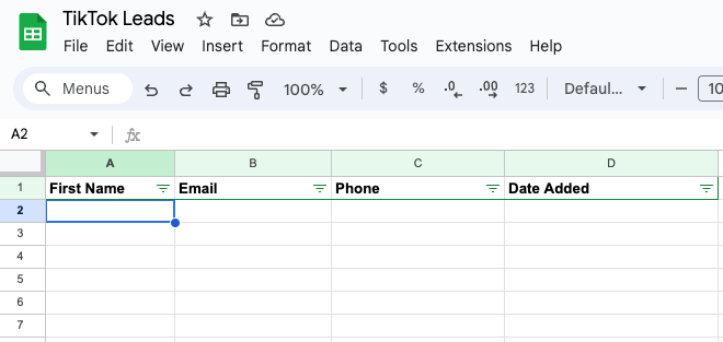 Create a Google Sheet: Create a Google Sheet where you’re going to store your lead data. Your sheet should include columns for all the fields you’ve included in your TikTok lead ads.