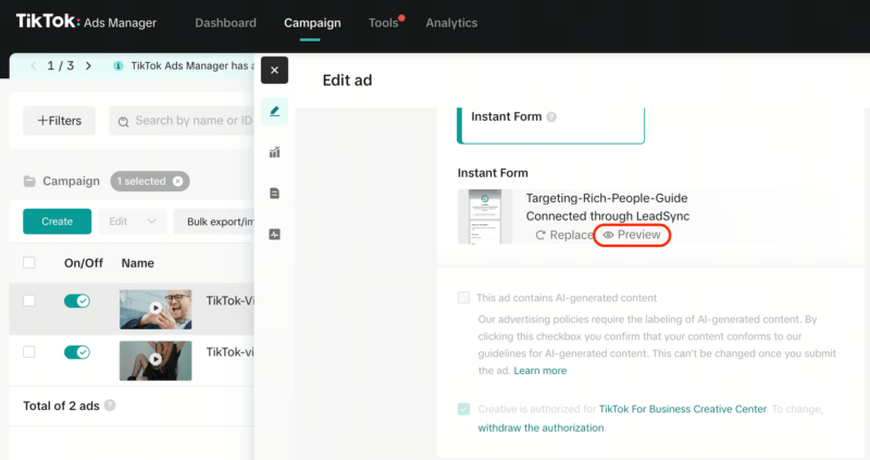 You can create a test lead from your TikTok Ads account by editing your ad and finding the Preview option in the Instant Form section.