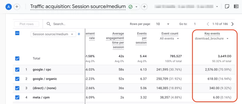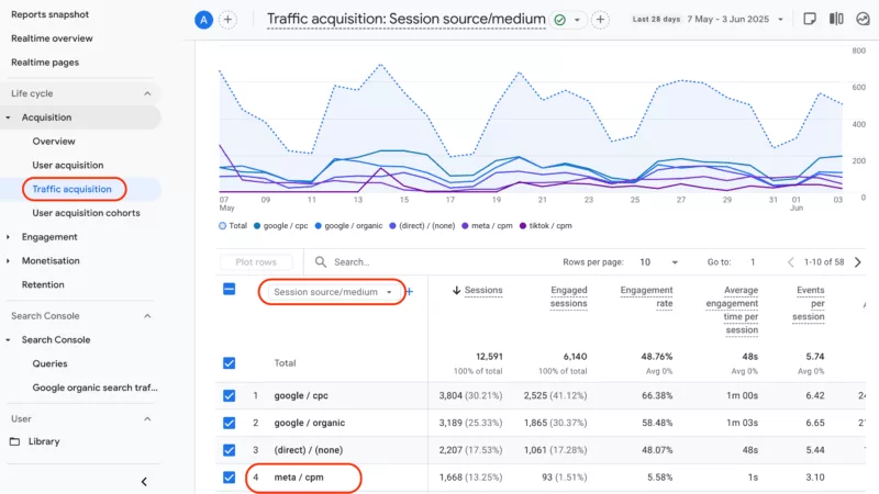 The traffic acquisition report differentiates between new and returning visitors, highlighting user navigation patterns. To focus specifically on Facebook ad data, follow these steps: