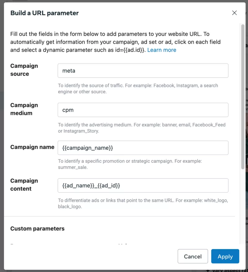 Fortunately Meta ads has it’s own inbuilt UTM builder alowing you to create UTM tracking codes when you’re creating your ads.